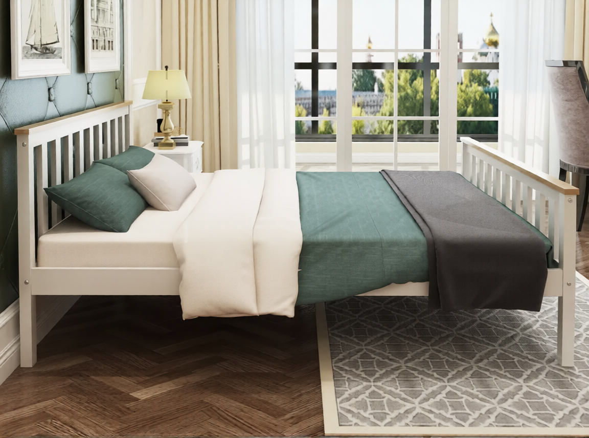 A modern take on traditional, inspired by the simple style of Shaker furniture. With a clean white painted frame, contrasted with light oak colour top rails on both the head and foot boards. Simple and Timeless.
